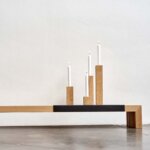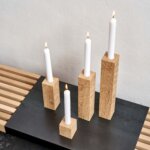 4 oak candlesticks (30, 22, 14 and 6 cm high) with magnet and ferro nero plate (22 x 35 cm)