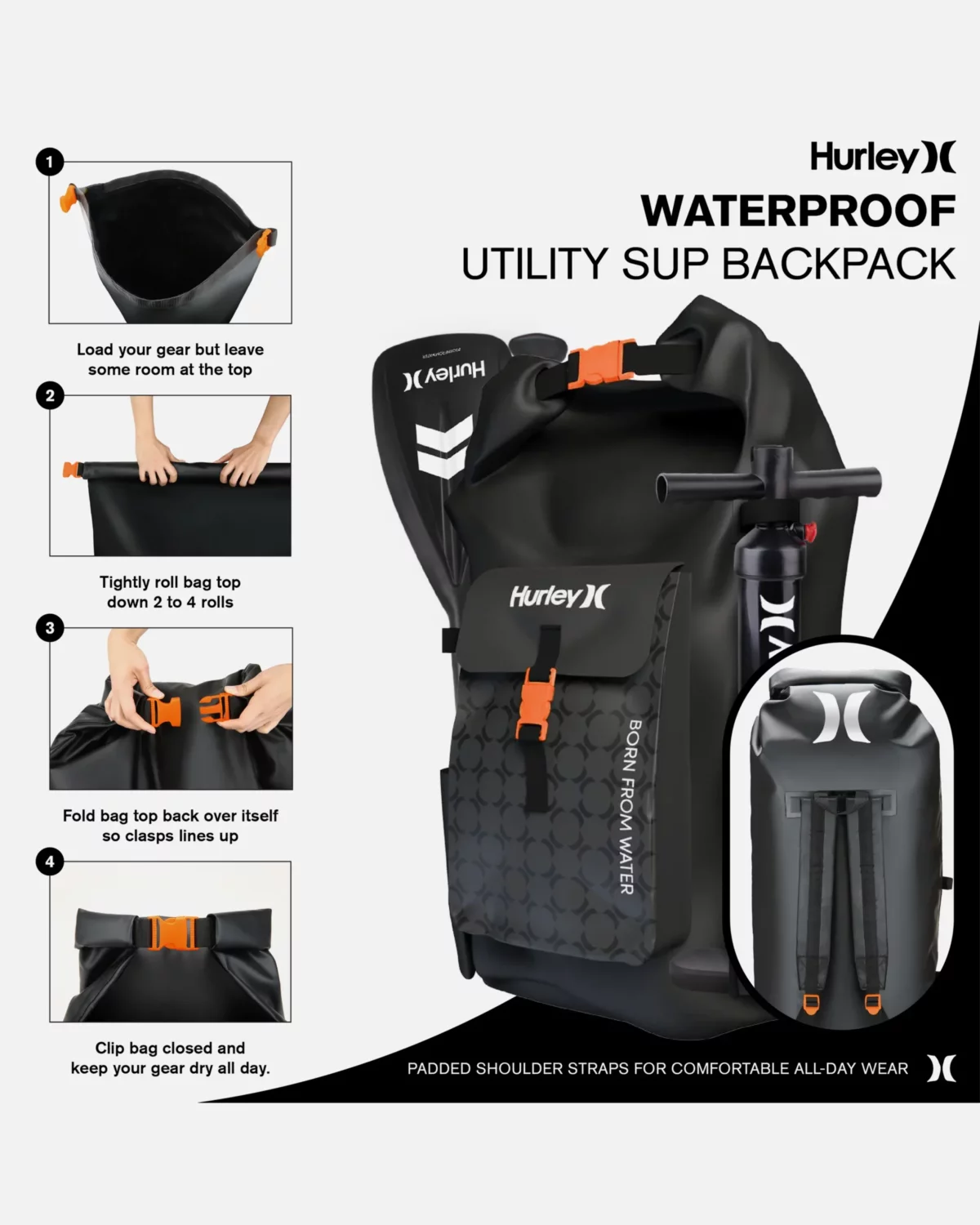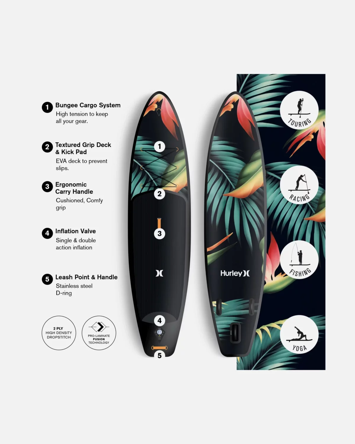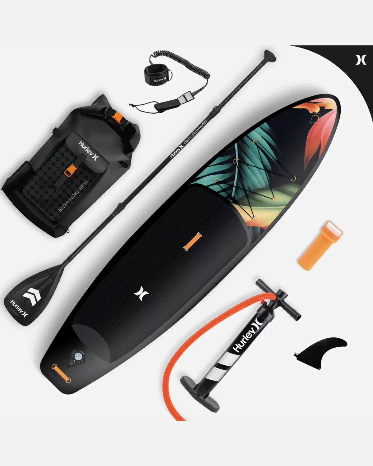 The board features a vibrant, digitally printed 3D color design on double-sided dropstitch material. A six-ring bungee net offers additional storage space. The entire kit, including board, Hurley brand leash, pump and fins, can be stored in a stylish 120L waterproof backpack, making it the ideal companion for lakes, rivers, canals and the sea.