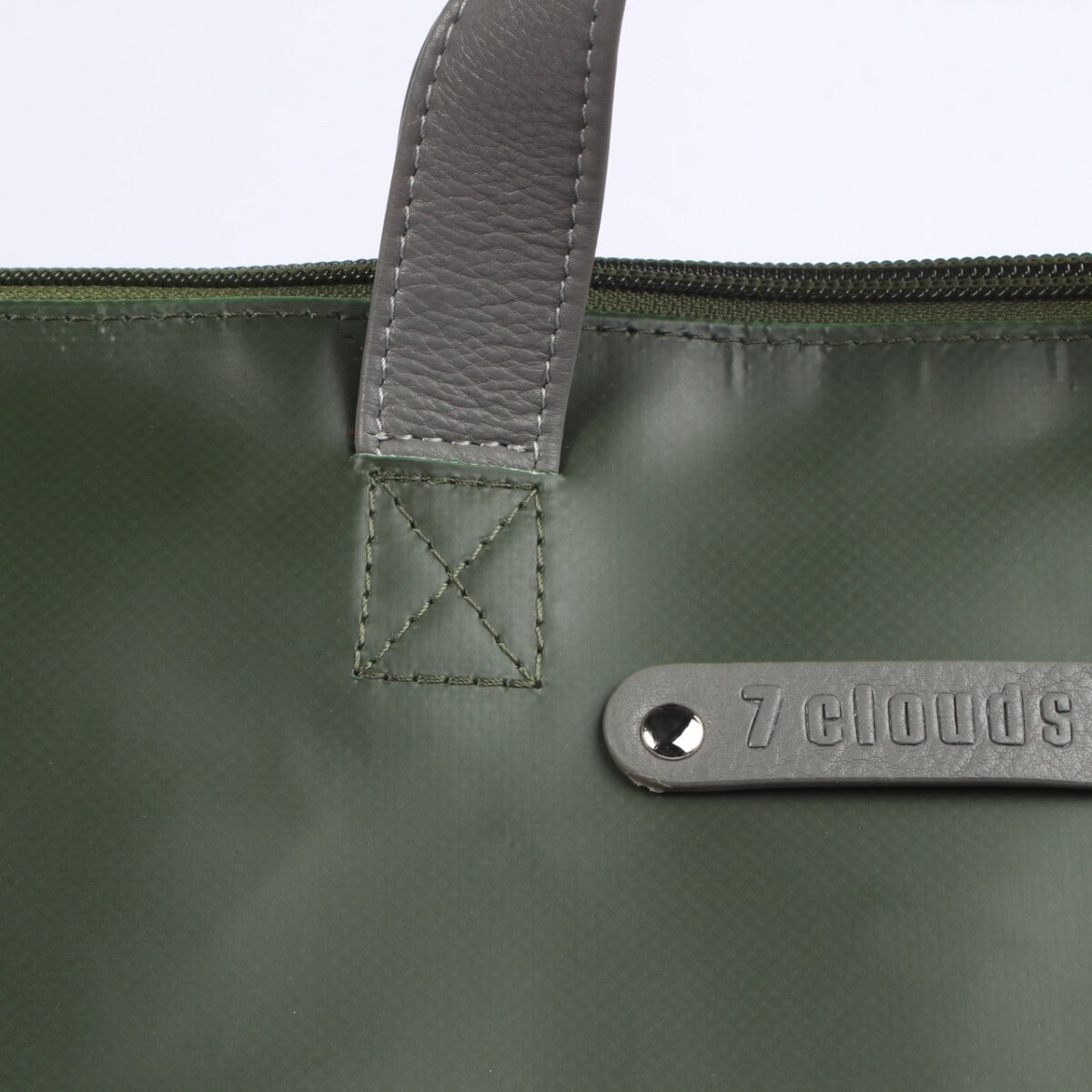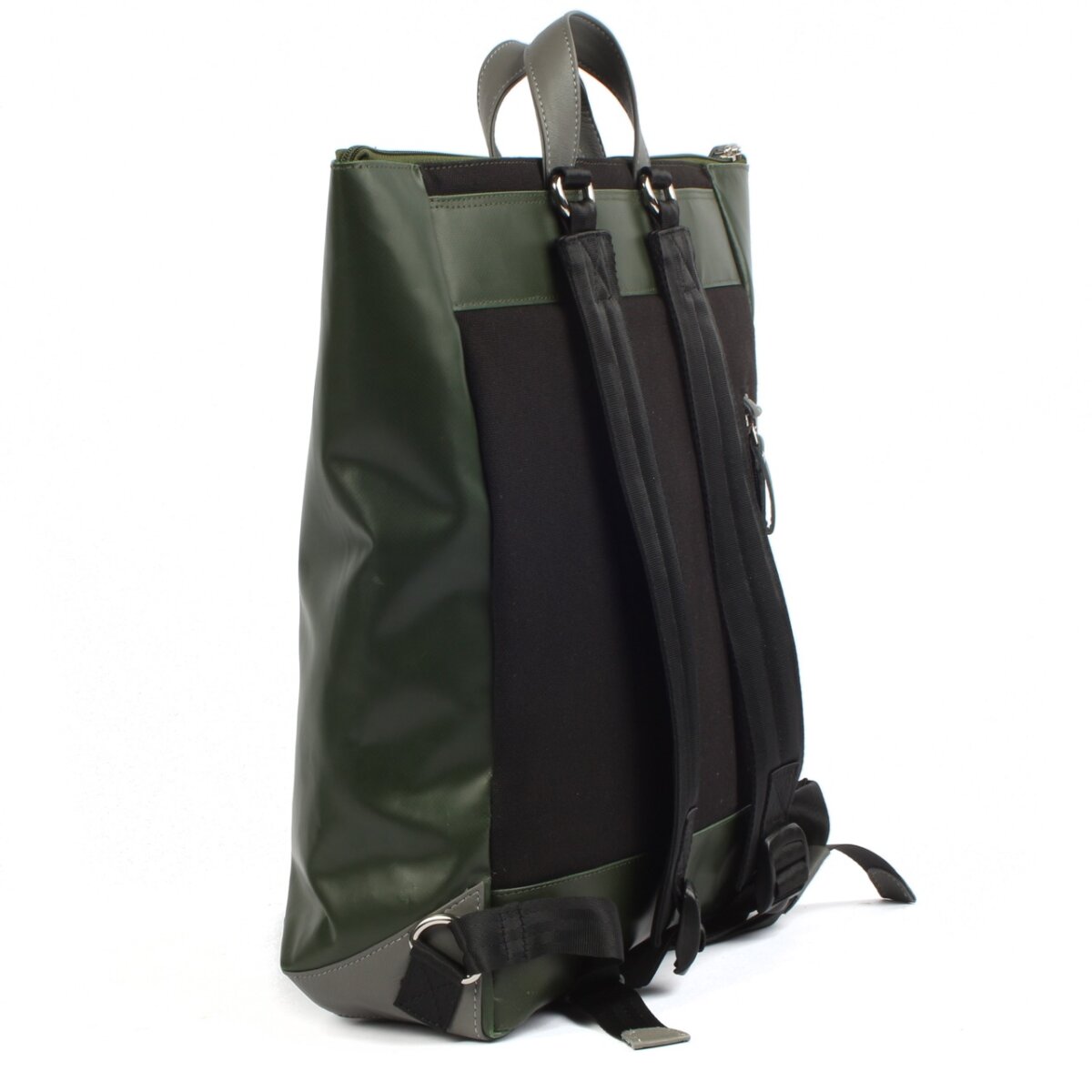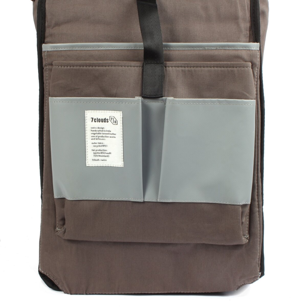 Elegant Shams 7.4 shopper backpack made from recycled polyester RPET and boat cover tarpaulin. With padded laptop and tablet compartment, robust cotton lining, vegetable-tanned leather. Size: H39 x D11 x W31cm, 13.2 liters, 0.9kg.