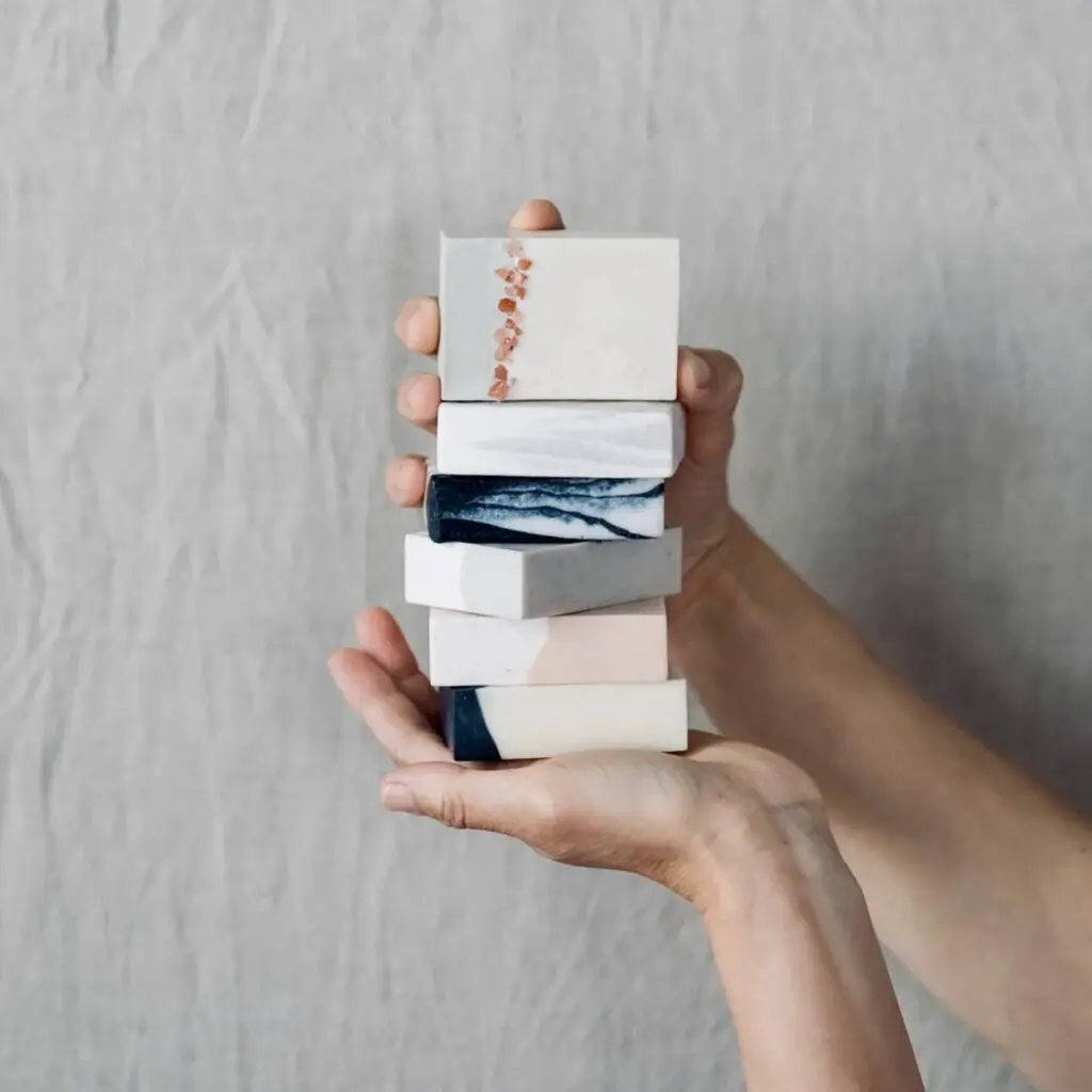 Le bundle contient 5 savons pour les mains différents. Un exercice d’équilibre. Frais et délicieux avec un soupçon de géranium rosat pour quelques notes florales douces et arrondies. Apaisant et réconfortant, jamais accablant. Utilisez-le dans la douche à la place du gel, dans la baignoire ou à côté de l’évier de votre salle de bains ou de votre cuisine. Ce savon laisse une sensation de peau nettoyée, fraîche et hydratée. Poids : 120g sansparaben – sans huile de palme – non testé sur les animaux – végétalien Ici, pas de place pour le plastique – tous les savons sont vendus dans des boîtes fabriquées à partir de gobelets de café recyclés. 100 % recyclé et recyclable. Fait à la main et unique – le poids du savon peut varier de quelques grammes et les designs diffèrent naturellement par pièce Mode d’emploi Faites mousser le savon entre vos mains et lavez avec la mousse épaisse et luxueuse. Si vous aimez appliquer le savon directement sur votre peau, il est conseillé de le placer dans un sachet de savon en coton afin de protéger les parties sensibles des grains de sel qui grattent facilement.